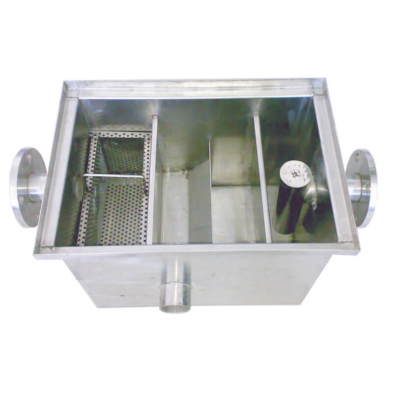 隔油池主要由兩槽'三槽'四槽分別組成,當(dāng)廚房排水流到第一槽時(shí),雜物框?qū)⑵渲械墓腆w雜物(菜葉等)截流除去,進(jìn)入第二槽后,利用油水密度差使油水分離。廢水沿第二槽隔油板向下流動(dòng),進(jìn)入第三槽后從物理裝置凈化流出,再經(jīng)出水管收集排出。第二槽中的油珠顆粒物沿隔油板集聚向上漂浮流動(dòng),始終浮在隔油池的第二槽內(nèi),經(jīng)過(guò)隔油處理的廢水則溢流入排水渠排出池外,進(jìn)行后續(xù)處理,以去除乳化油及其他污染物。